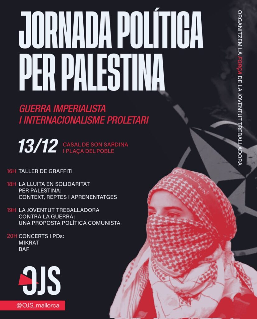 El pròxim dissabte 13 de desembre, l’Organització Juvenil Socialista de Mallorca organitzam una jornada política per xerrar sobre Palestina al casal de Son Sardina. Hi haurà un taller de grafiti, dues ponències, sopar i concerts. Des de l’organització creim que, ara més que mai, hem de continuar xerrant sobre Palestina i debatre sobre quines són les tasques de les organitzacions polítiques envers la necessitat de construir una solidaritat internacionalista.